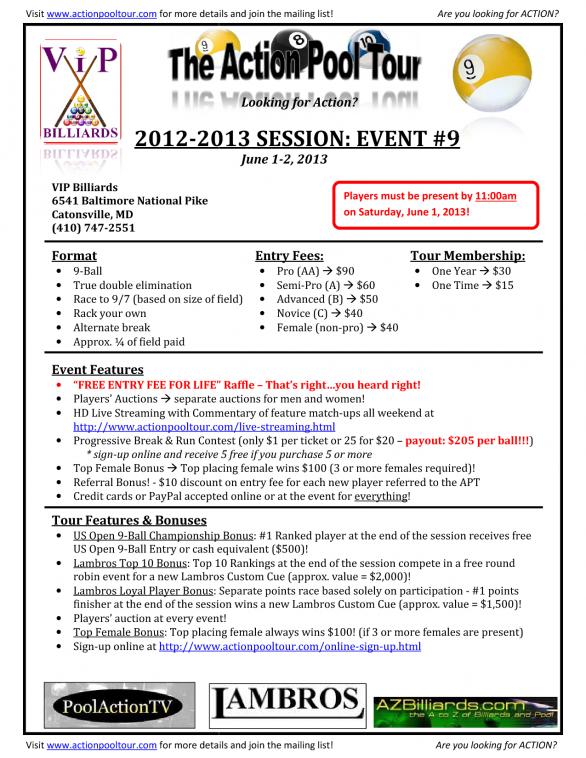manfromoz Banned Jun 1, 2013 #1 We are live now from VIP Billiards in Catonsville, MD! Watch some of the best players on the east coast at http://www.actionpooltour.com/live-streaming.html!