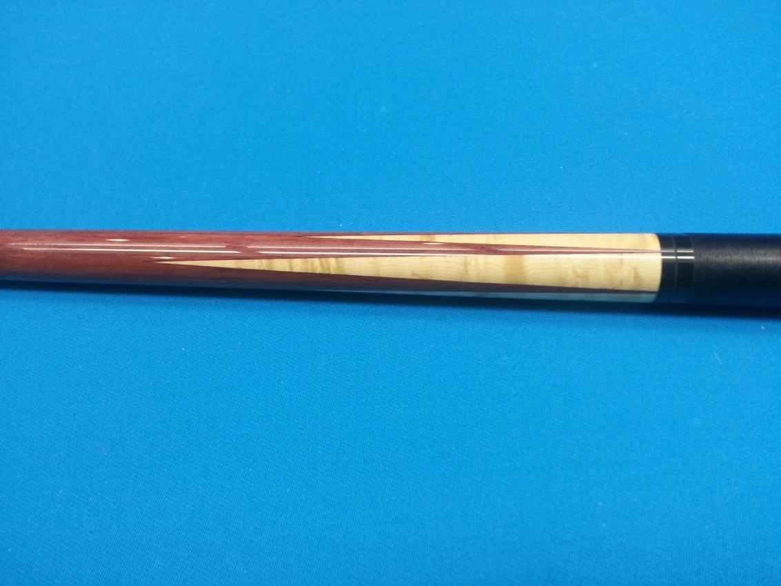 The forearm of the cue is constructed of six birdseye points (three high and three low) into purpleheart, and the buttsleeve is purpleheart with fancy rings near the buttcap.