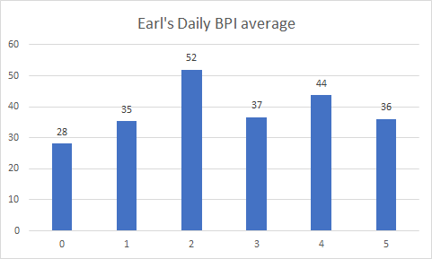 His 10-inning average topped out at 74.5 BPI, but then he had a bunch of poor runs and at the end of the day he's at 20.5 BPI.
