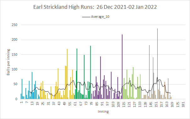 I’ve also enjoyed watching him, despite the frustration sometimes. I haven’t been playing 14.1 for very long, and I have no one to play with, so all my knowledge has come from watching stellar examples of straight pool on YouTube. As such, I’ve set extremely high standards for myself in terms of finding a perfect break ball, key ball, etc. Watching Earl has made me realize that sometimes, it’s okay to not be perfect, that’s it better to give yourself a chance by playing off three rails to get on a break ball, or to leave yourself a non-traditional break ball, than doggedly strive for “perfection” and fail.