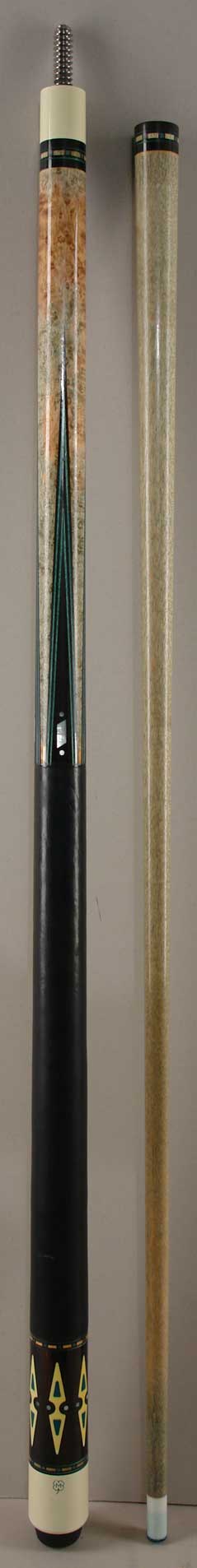 I feel very Lucky to have a minty 1975 McDermott. Has just a few finish chips on the butt sleeve that I am told can be fixed perfectly without a refinish. The rest of the cue is perfect. First year. Green bumper. Rare. I found out that some knowledgeable cue people around here didn't even know that the old McDermotts had color coordinated bumpers. These are exactly the same bumpers as the MR(A),B,C,D Series black bumpers except they are in colors that match the butt sleeves and wraps of the cues.