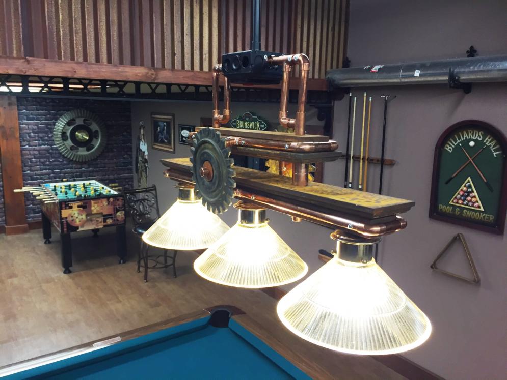 The other table is a 1966 Gandy 8'+ that I restored six years ago. At that time I had not thought about this whole steampunk man cave project. So that table doesn't quite fit in with the rest of the decor. This table has eighteen 1966 quarters inlaid into the top rails where the points are located. I created the black carbon fiber, printed and laminated it, then wrapped everything.