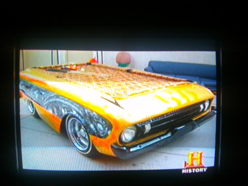 I would have to pass especially at the price tag that Rick from Pawn Stars paid, $8,000. I like leopard print but this is hideous, certainly cannot be Simonis. They said you level it by putting air in and out of the tires, haha. This was shown on Count's Kustoms and was made from a beat Ranchero, sorry for the crappy cell pics but I could not find any images of it online. :cool: