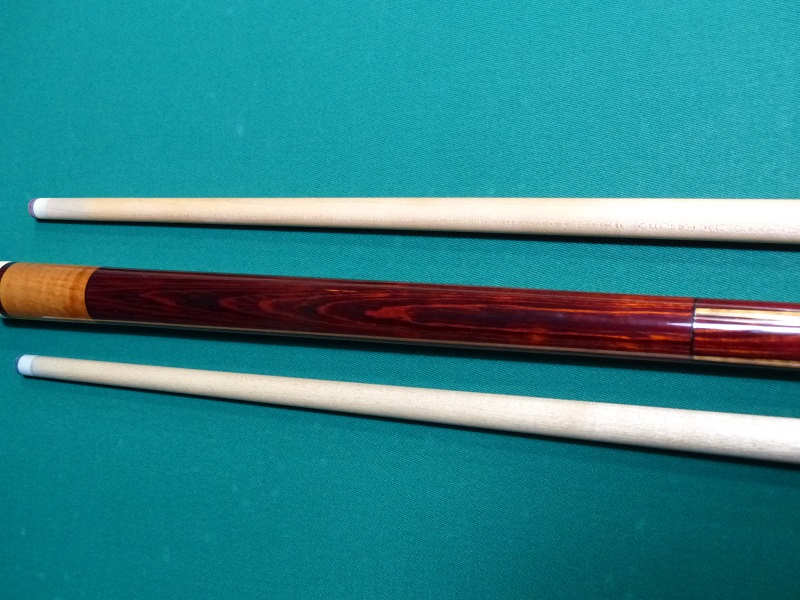 Butt: 4 rosewood points w/thin veneer on each; rosewood hoppe style ring; honey color maple forearm and buttsleeve; rosewood wrapless handle; 29” including the bumper; Radial pin; Adjustable weight w/weight bolts 12.95oz – 3 weight bolts totaling 2.48oz. Straight
