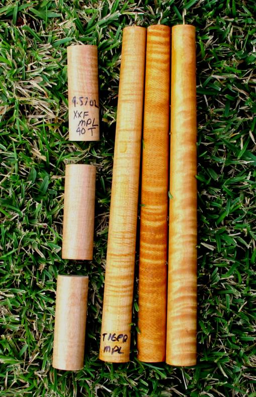 Tiger Maple Cones 14" long, 1" on small end 1 1/4" on big end. Butt pieces included. Dry and seasoned for 10 years. Sealed with a coat of shellac.