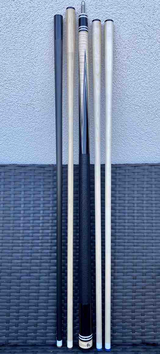 This cue is an amazing player. And it is in excellent near mint condition. No dings on the butt anywhere! Very smooth and nice leather wrap. One wood shaft has a couple very minor dings not in the stroking area. The other shafts are perfect. Everything rolls STRAIGHT. Radial pin. The CF shaft is made by Tim Monk. Tim makes one of the best CF shafts available in my opinion. And you can’t get them unless you have one of his cues. It’s a far better hit than any other CF shaft I’ve tried. This cue has been my player for the last year or so and it pains me to let it go. But I’m saving up to put in a custom order with Tim. I love a longer cue but this one doesn’t ‘feel’ longer. The balance and weight are perfect. I use this on a 7’ bar box or full-size table...it just feels natural. Tim has a lot of experience building longer cues and he has it down imo.