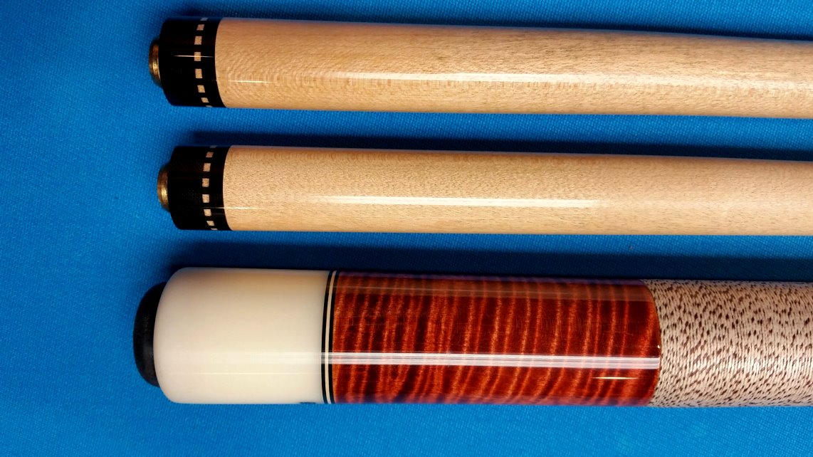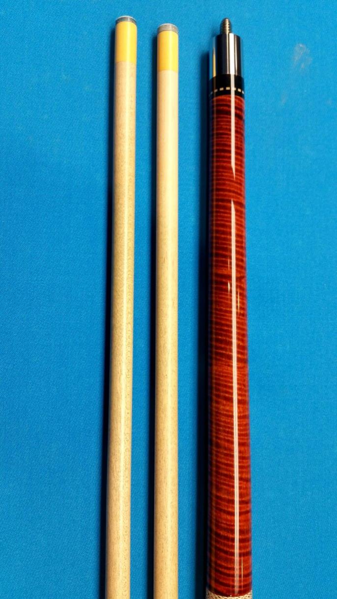 This one is an early logo merry widow with the most highly-figured curly maple I have ever seen used on a cue. Just back from a complete refinish at Bob Frey's shop, all 3 pieces are in like new condition. Everything rolls straight, together and apart. Shafts are full.