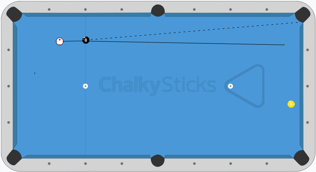 1. Cueing high unnecessarily. (Diagram 1). When shooting a medium speed follow shot from distance they cue way too high. Why? The table will develop the roll on the cue ball anyway, there is no reason to make the shot more difficult by shooting extremely high. Just cue half a tip above center and let the cue ball develop roll on it's own. A common mistake is to think that cueing very high gives it 'overspin', but in reality the highest you can strike the cue ball will just have it rolling naturally off the tip. Overspin can only be achieved when the cue ball strikes an object ball. Similarly 'force follow' is a weird term. Follow is just roll, so 'force follow' is just a fast roll. When I set up shots with follow for my students they'll ask me "How high are you hitting that?" and I respond "I consider the distance and speed, then I cue just high enough to ensure it is fully rolling when it reaches the object ball. Letting the table develop roll is very important as you add sidespin, because if you're cueing high you can't get as far to the side, so you are limiting your tools by habitually going to the top of the ball without need.