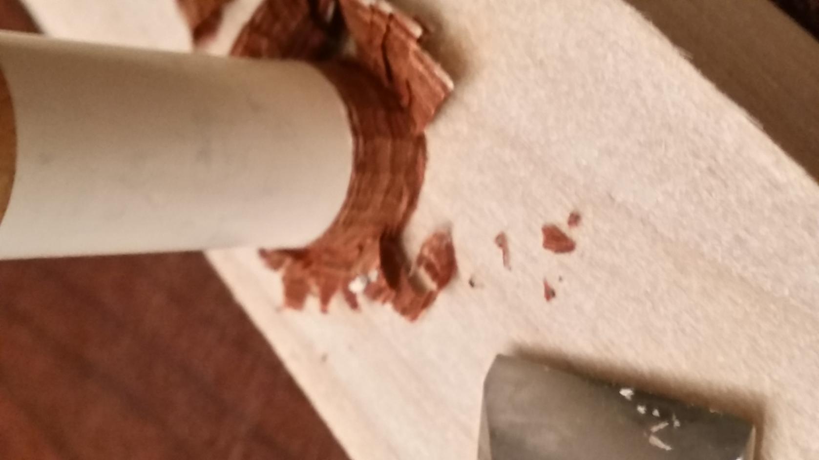 8. Repeat again on the higher spots left from the first series of cuts to remove additional excess material. Repeat as necessary to allow a skimming style cut with the chisel skewed, while carefully rotating the cue by hand along your pants leg (seated position)