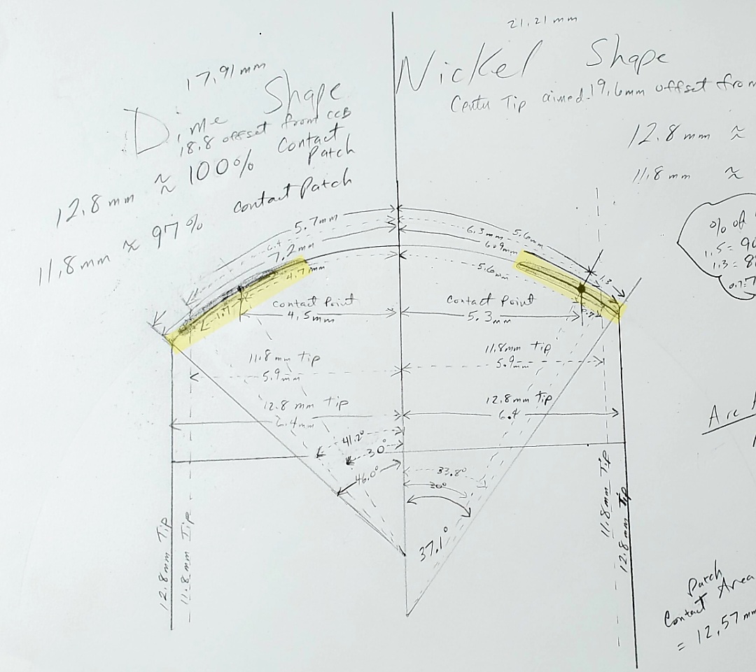 This sketch is bit confusing, but it's a magified (10x) view of a tip. The right side is a nickel radius, left side is dime. The highlighted areas show how the 4mm contact patch fits the available tip surface. I'd like to redo the drawing, clean it up and get rid of a lot of the lines and unneeded measurements.