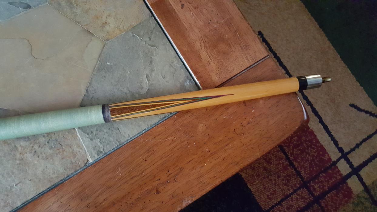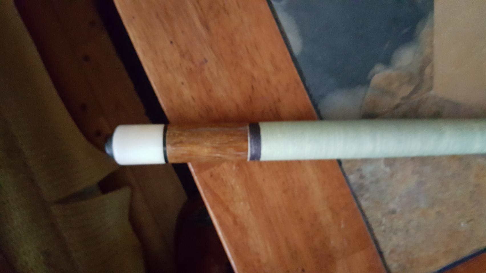 Here are a few pics of my Titleist conversion. The cue was made by "Tex" Fitzgerald in Chicago. I bought it from Tex, new, in 1972 or so. The cue has a brass 5/16 by 18 pin and a stainless steel collar. The butt cap is not ivory but not plastic either. I bought it with two solid maple shafts that I still use.