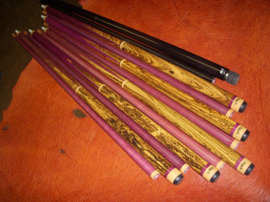 Up for sale your choice TNT Black Phantom Break Jump or a Bocote into Purpleheart Summit Break Jump cue. Value priced at $225.00 delivered in the USA. These will go fast. A couple really nice figured Bocote ones.
