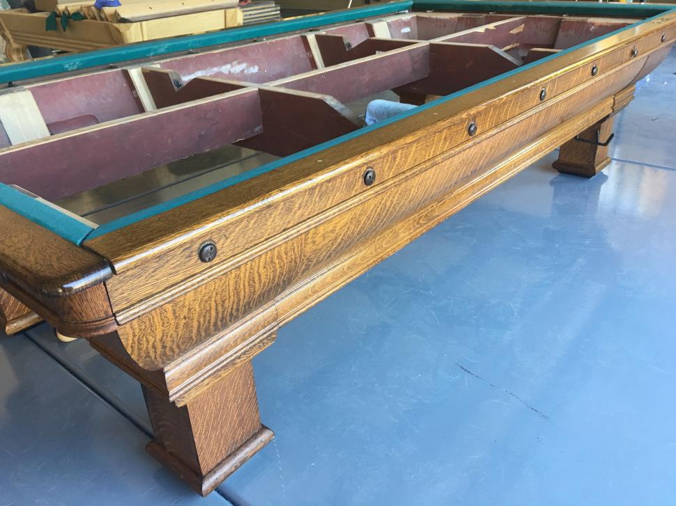 If you were wanting to turn it into a 10 ft pocket table, then I'd say sure, that's doable, but to cut it down and turn it into a 9ft pocket table.....not a chance in hell, I don't care what anybody says. You can't just cut the outside cabinet dimensions down in size to a 9ft, you have to cut everything down proportionately, not just the cabinet. The cross members would have to be cut down and the attachment points of them would have to be moved as well in order to match up to a 9ft 3 piece slate at the seams....speaking of which, would also have to be cut down as 3 individual pieces of slate, not just the outside dimensions. Rail bolt anchors would have to be drilled starting all over again which would mean the slates would have to be drilled vertically as well as horizontally, and pocket shelfs would have to be cut as well...AND, the frame would have to be modified to accommodate the wood slate shelf to make room for the drop pockets....of which you'd still have to find to fit. Rail bolt holes would have to be drilled....to match up with the slate bolt holes....and new rail sights would have to be drilled and installed......it's just not possible to do something like you're wondering about, in fact, it would be cheaper and easier to just built a new pool table from scratch.....at least then you MIGHT have something worth selling.