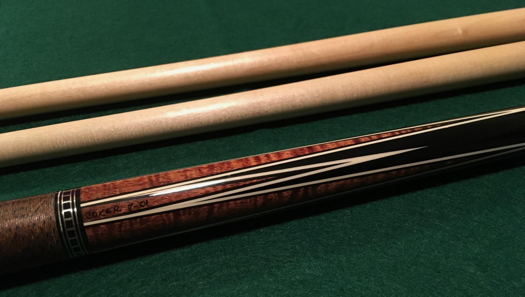 Selling my beautiful Tom Coker 16 point (8 in forearm, 8 in sleeve) Gaboon Ebony & Curly Koa cue. The cue is in near mint condition, just a couple of surface scuffs in the clear coat. The cue comes with 2 shafts with new PreciSion medium tips. Also comes with custom Gaboon Ebony & Avorin Joint Protectors. Butt and both shafts roll dead straight, together and apart. PM for any questions. Thanks.