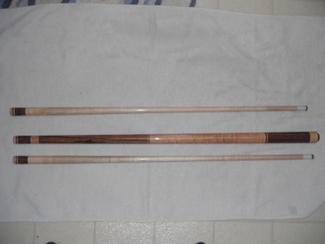 True wood-to-wood joint 3/8-10 SS pin, 19.5 oz. This cue has an awesome "feel" to it and very well balanced. Shaft #1 13.12 mm, 4.28 oz., medium layered-WB tip "Shooter" by Adams Ltd. Shaft #2 13.18 mm, 4.45 oz, original Moori medium. Butt weighs 15.2 ounces, 0.829" at joint, 1.22" at buttcap. Balance point at 19" with lighter shaft. Cue will be sold with matching Bocote/TSM joint protectors (1B/3S) with matching rings built by Jim Baxter.
