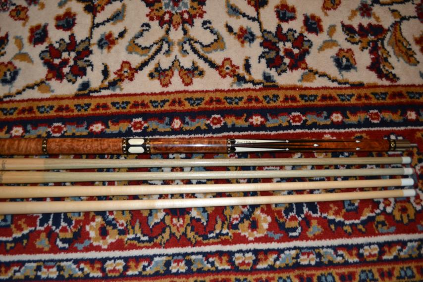A Jacoby Custom Cue with 4 shafts.(Pics only show 3) Two stock shafts and two Jacoby Hybird Edge Shafts with Kamui Med tips on them. Cue is prefect and is a one of a kind. Brandon (From Jacoby) and I designed it and it was built in 2009. Butt of cue is turned a little smaller then stock (1.180) to help with the balance and really feels great. Everyone that has hit a ball with it loves the feel of it. Weight can be adjusted from 18 to 21 oz if needed