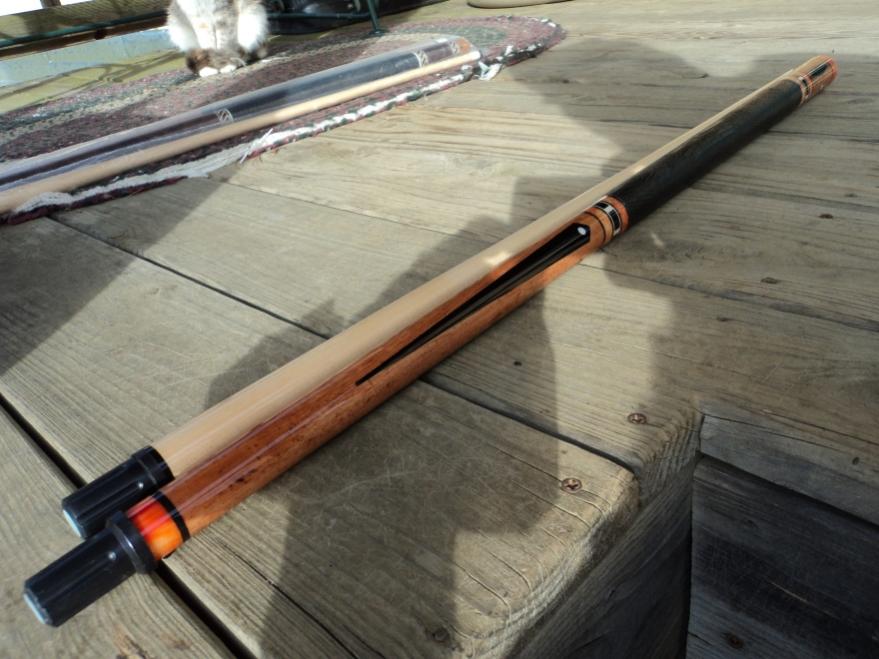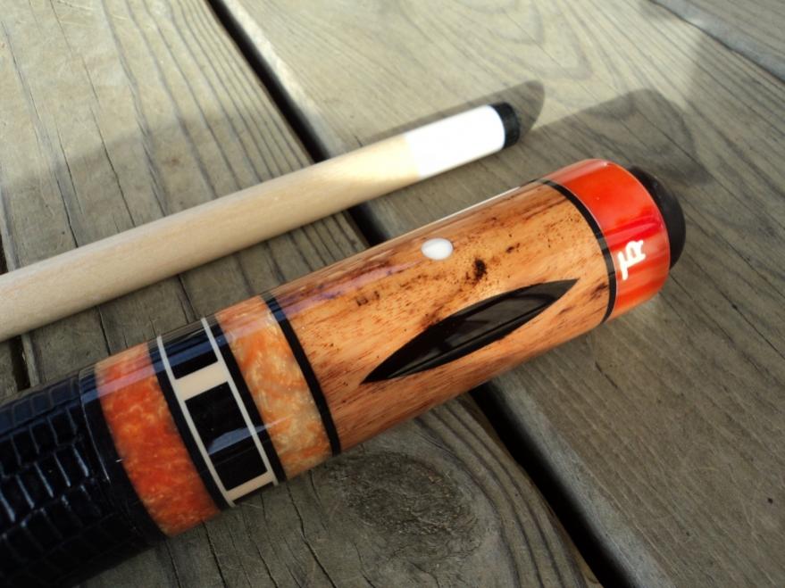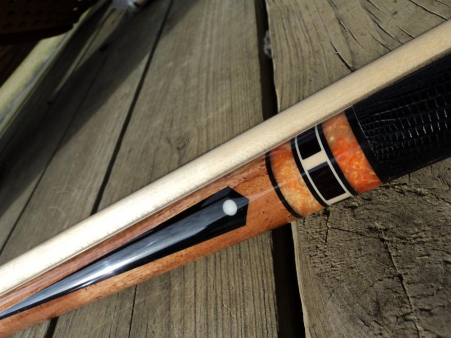 for the past 5 yrs. i have been a part of the toys 4 tots pool tournament here in s.w. va..it is a personal goal of mine each year to build and donate something kinda special.this is this years cue: urundel wood,ebony inlays,acrylic rings,orange juma joint and butt cap,w/ black leather wrap,,,,enjoy and happy holidays.
