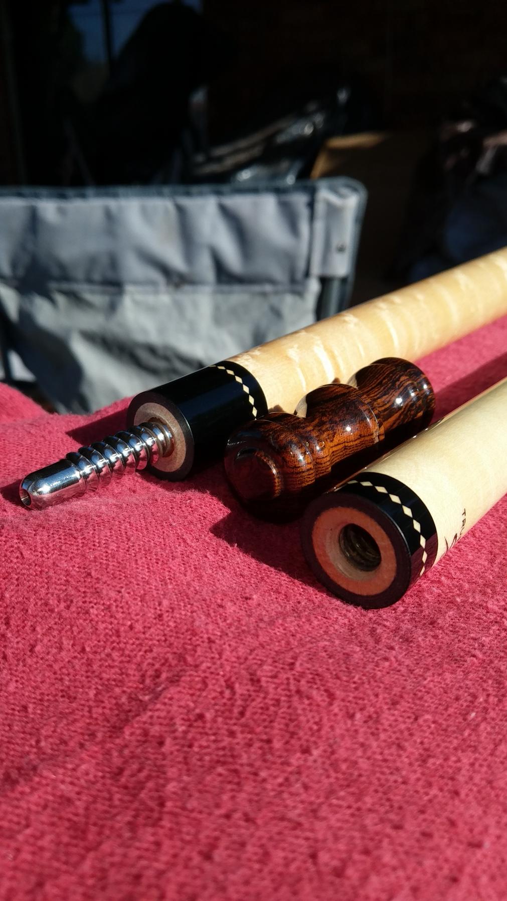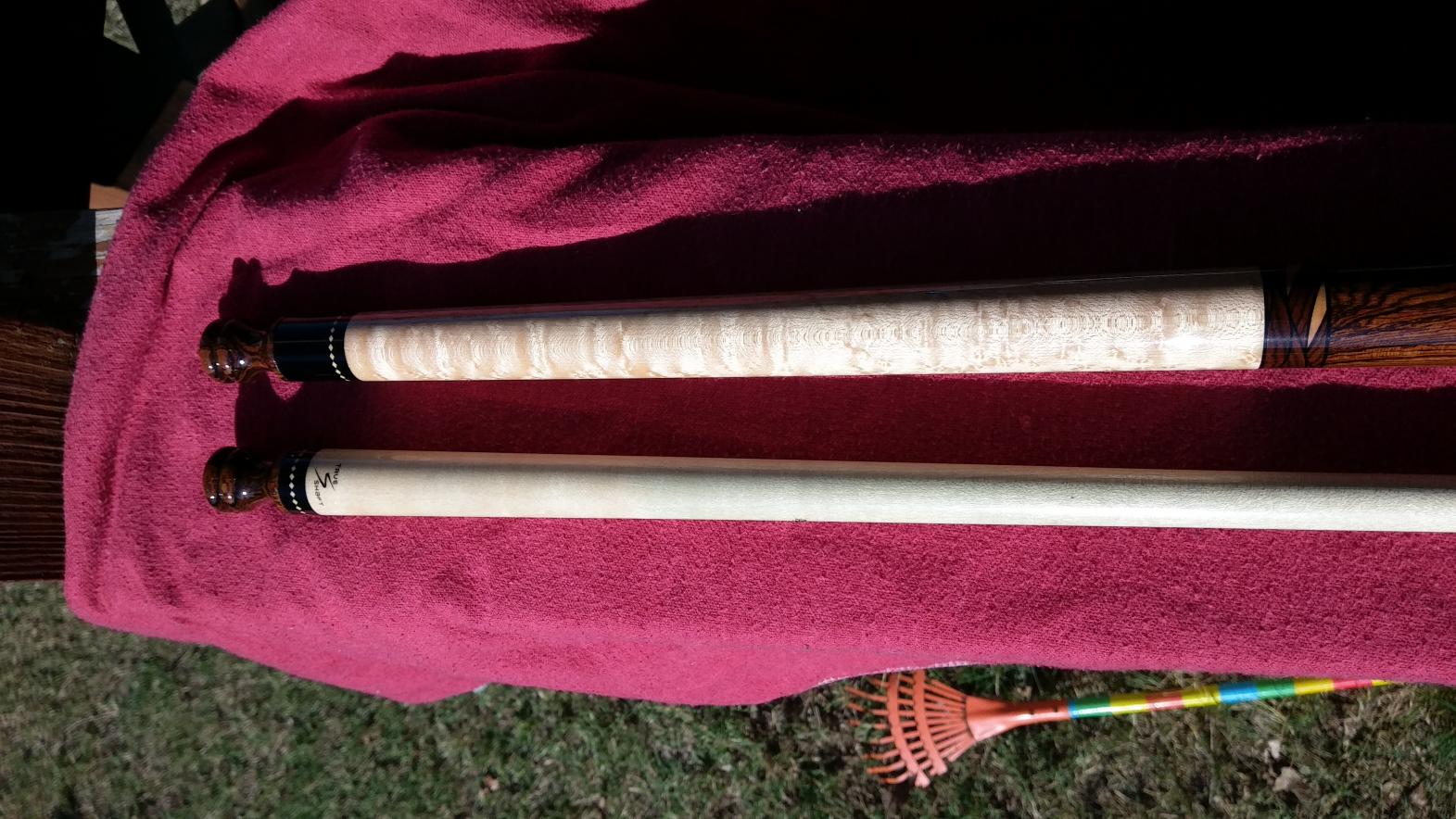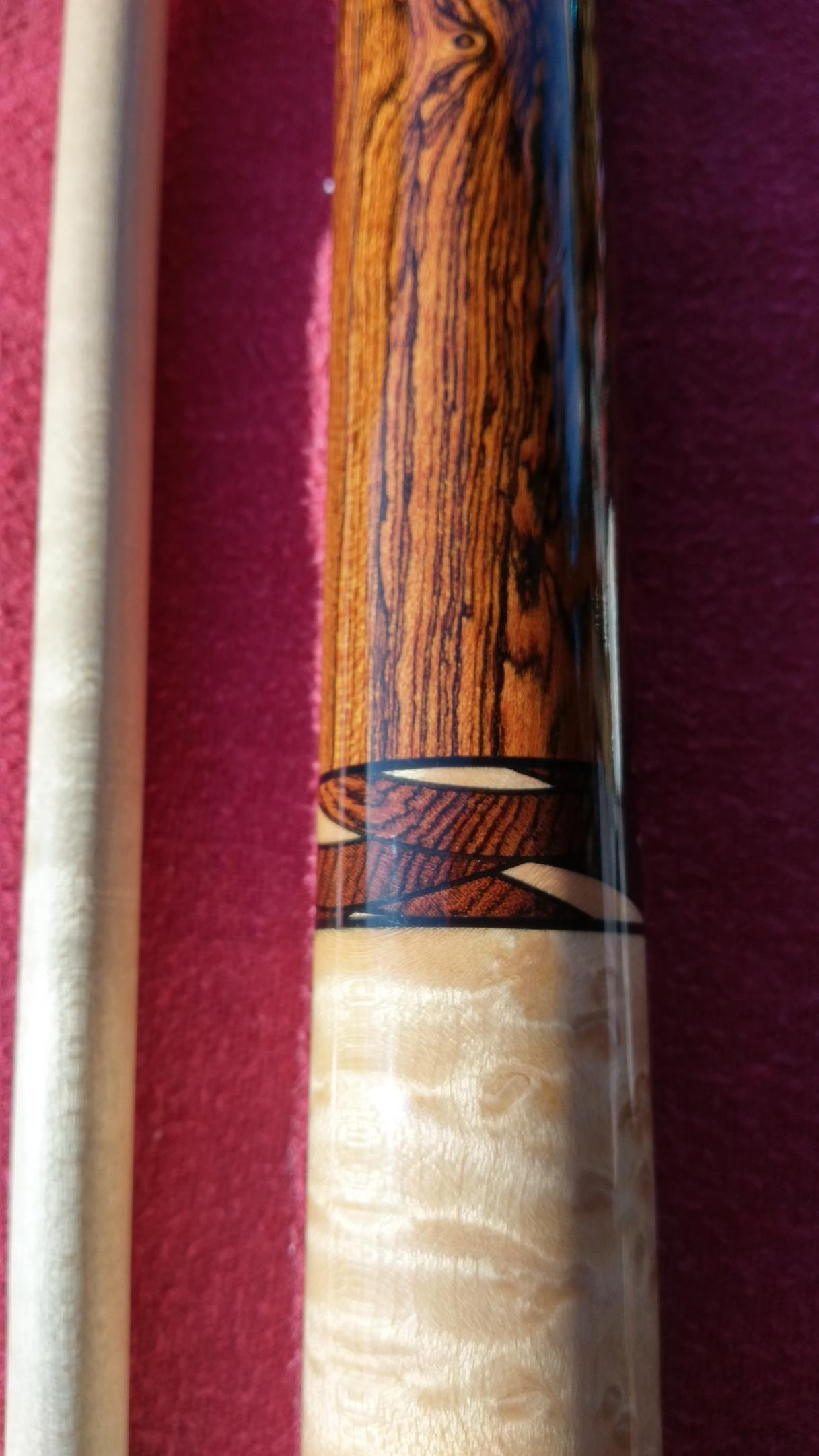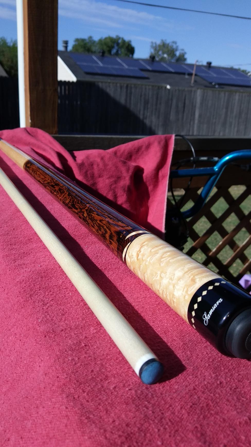 $$traded $$$ also interested in cues for trades I prefer wrapless some leather wraps are OK.I like radial pin and 3/8 10 flat faced into wood or phenolic insert.11.75-12.5mm prefered . I love exotic woods. Up for trade or sale is a Samsara plain Jane w fancy scalloped ring work on both sides of the bacoté handle 3x birdseye forearm and butt w samsaras single row diamond ring work at the butt cap joint and the shaft. The shaft is the new 11.75mm samsara lD true shaft 58" and 19.5 oz almost like new one small dent in the clear on the handle can't get in pic open to offers txt or call 214-448-2491 for faster response thanks