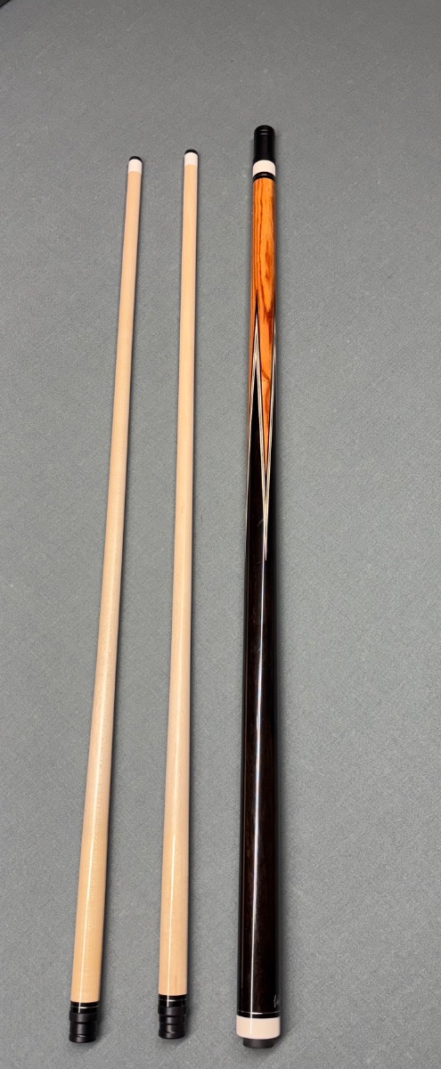 I have a nice Brent Summers/Bill Lister Ebony/Tulipwood full splice, near mint condition. I’m looking for a wrapless cue that has a 3/8x10 pin in similar condition.