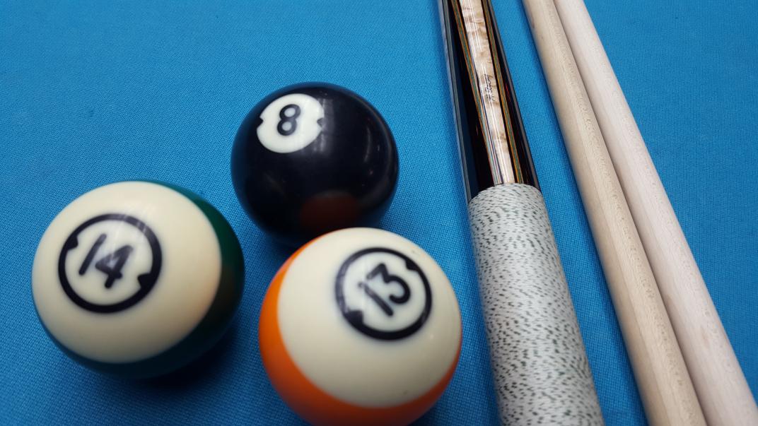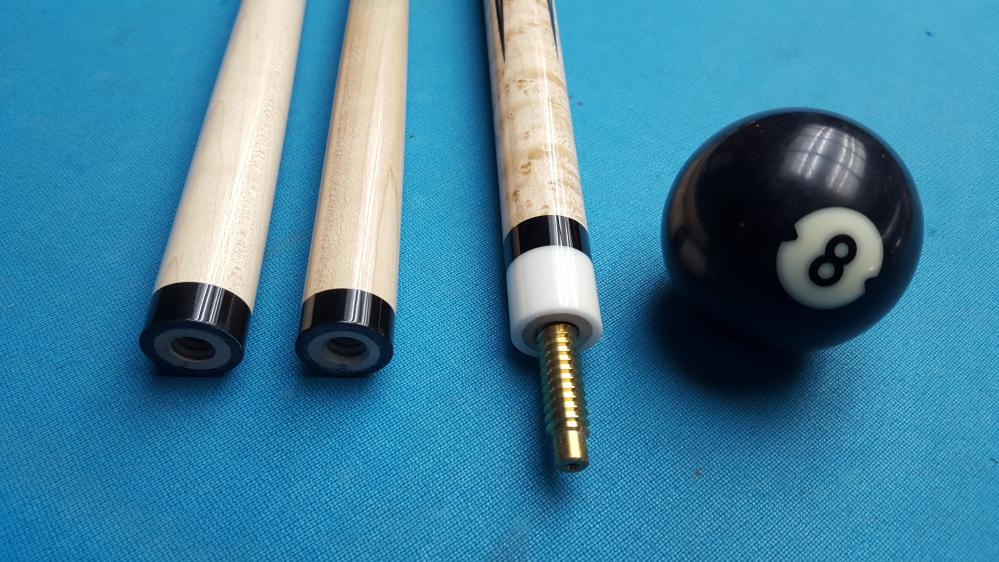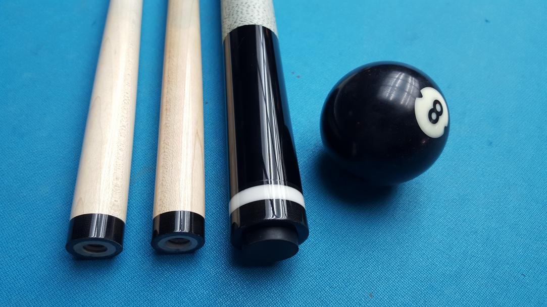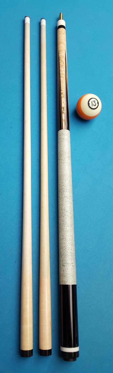 Beautiful traditional cue with Gabon Ebony sharp pionts and butt section. Nice black, orange, green and orange veneers. Nice classic looking pressed white with green specks linen wrap. Black linen phenolic joint and butt rings. Easy match-up to aftermarket shafts. 3/8-11 Southwest style brass pin.