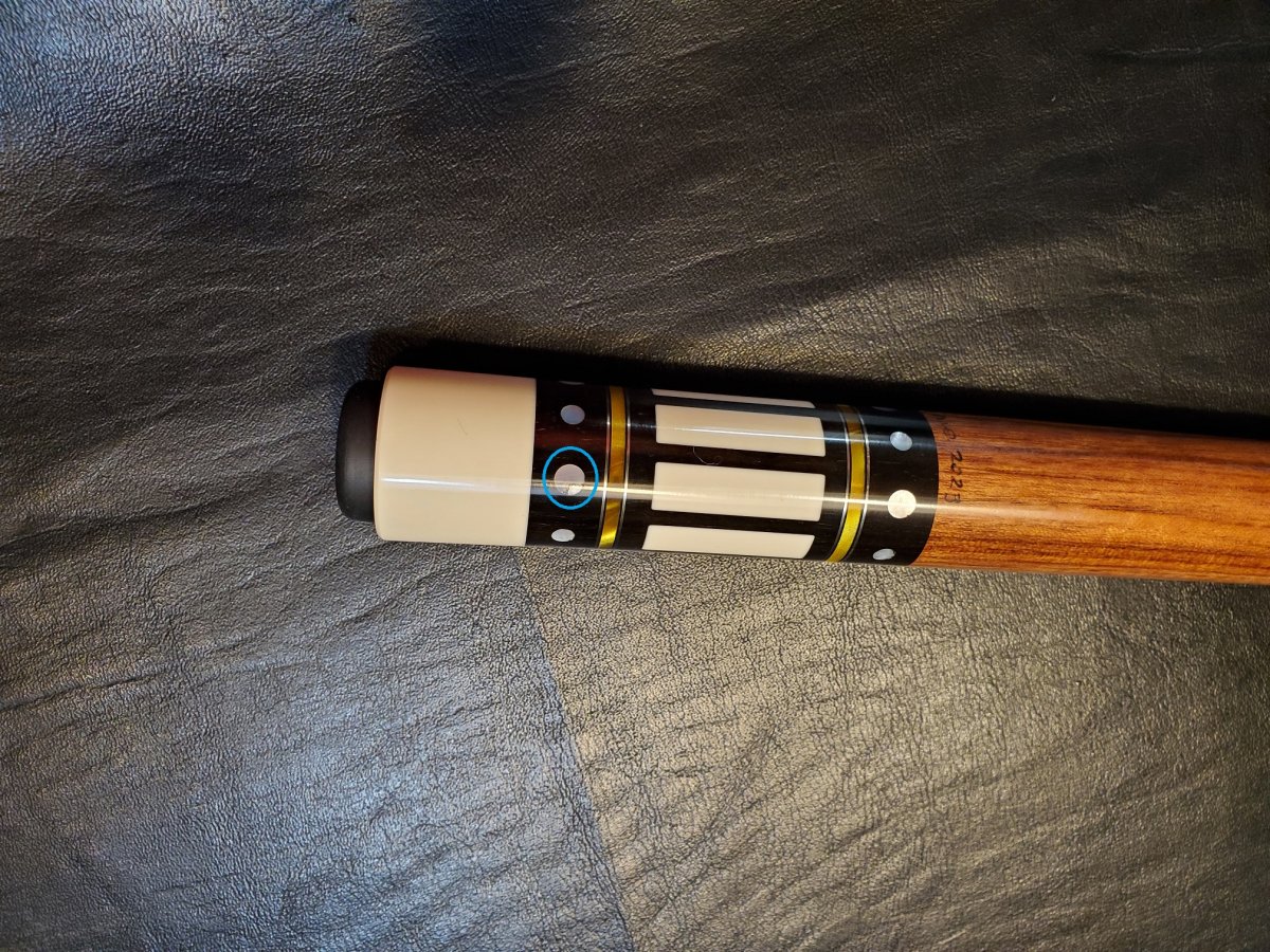 I built this cue as a prototype to test out my design ides for this type of cue. I really wasn't a fan of some of the other designs I've seen making a 3 pc cue. I wanted to do something that looked more natural and not out of place compared to other cue designs. The cue plays as solid as any cue I've built, well balanced, a good player. The cue is heavy @ 21oz, I don't mind a heavy cue! The balance point is in a normal position even with the heavier weight, the cue feels lighter than it is because of this, at least to me..lol