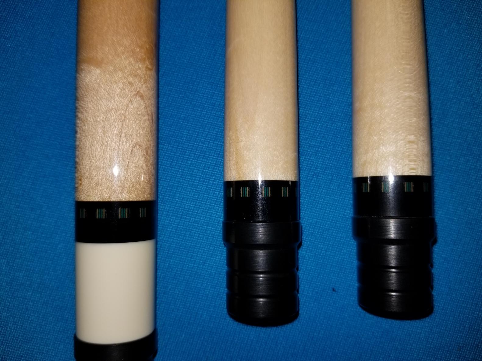 The points are crisp and are purple heart, maple, purple, green, purple from inside to out. With the leather wrap and color accented rings at the joint, the cue has a definite sense of style while maintaining a classic look.