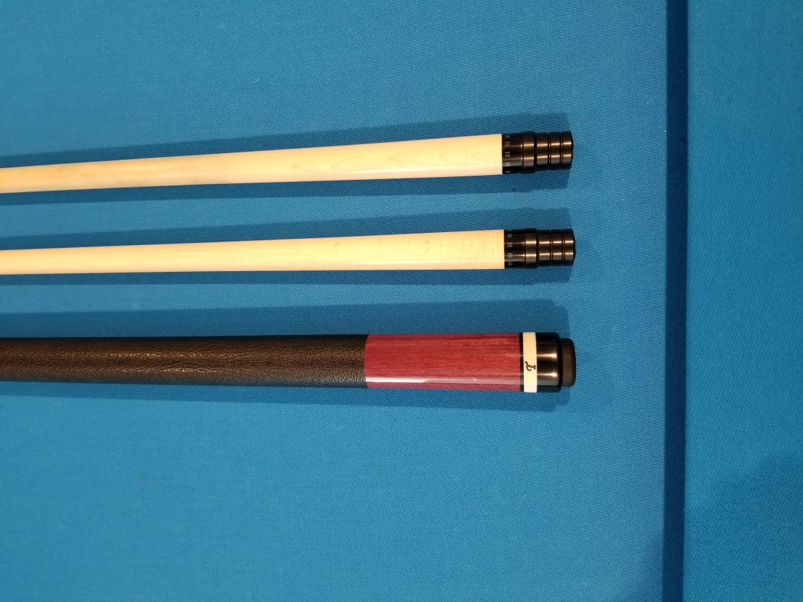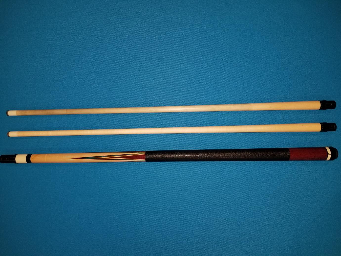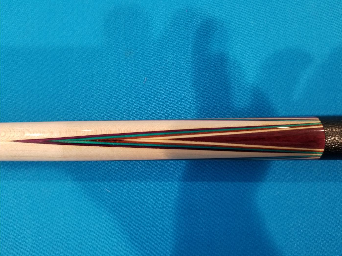 The handle is 15.3oz and has really sharp points that are purple heart, maple, purple, green, purple from inside to out. I believe the butt cap is also purple heart but looks a bit brown to me. The only mark on the cue is a small ding on the butt cap.