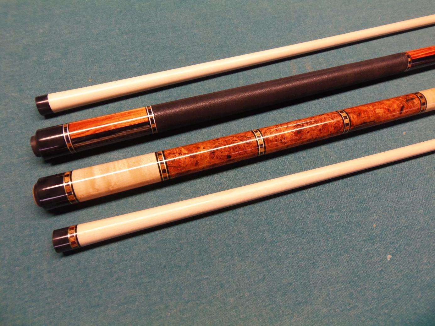 Just finished these cues. One is tulipwood laminated with ebony colored WebbWood. The other has a segmented handle section of cherry burl with a purpleheart core and maple forearm.