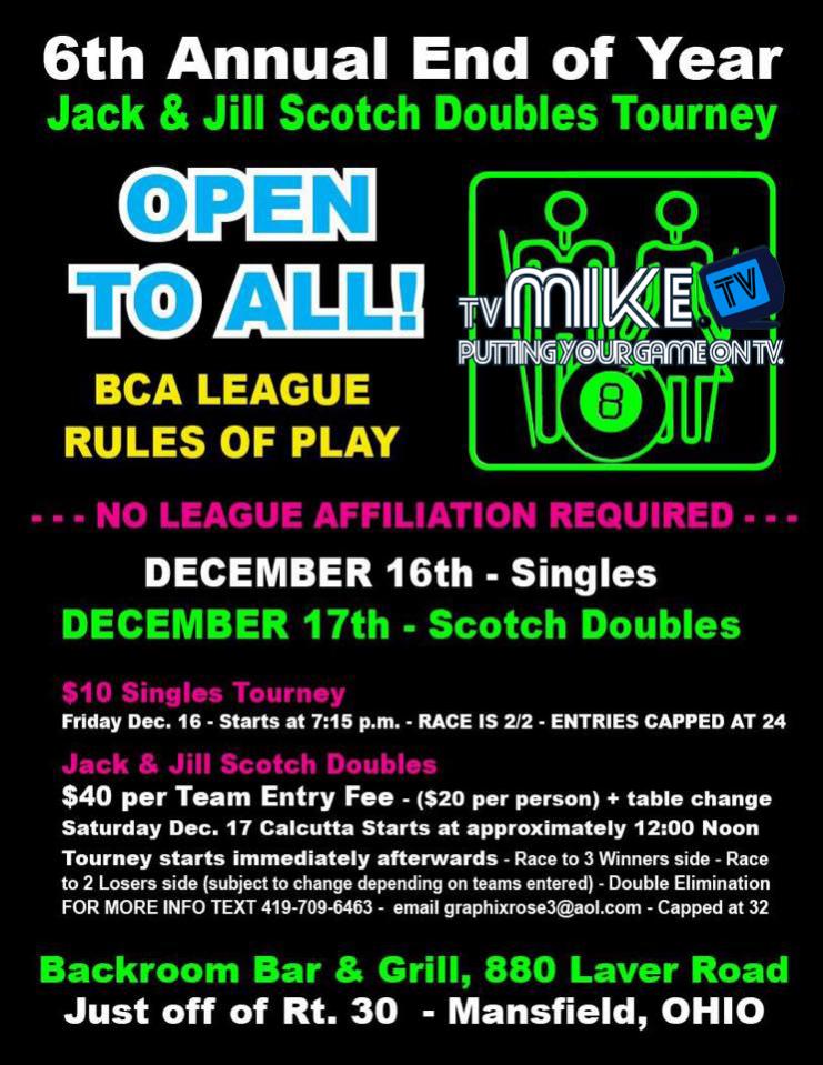 TVmike Professional Live Stream Silver Member Dec 17, 2016 #2 today Jack n Jill We are LIVE - Ice storm and all - 20 teams to play holiday Jack n Jill Doubles. Playing races of 3/2 BCA rules - Lets get rumbling - http://www.tvmike.tv