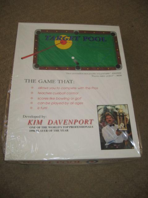 This is a rare and unopened Kim Davenport's Target Pool. The cellophane covering, is partially torn, but must be fully torn for the box to be opened. It remained undisturbed in my collection for approx. 20 years. This has never been opened, so its condition is new. This is very hard to find, especially in an unopened condition and is not only quite collectible, but if utilized, improves your pool shooting skills! Note: A rare four page Target Pool advertising color brochure is included at no extra cost. If interested, contact me at noddon1@aol.com.