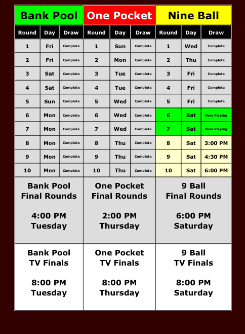 Having all the finals in 1 day is a very cool thing that should be considered. I don't think it ever would be but it would add a cool element to each event imo. And would be good for spectators to know for certain when the finals will be. Could probably charge a hefty premium for the final day as well.I’m hoping they don’t simply put 9 Ball finals on the last Sunday night. It’s nice to be done with it on Saturday and then check out/fly/drive in Sunday.