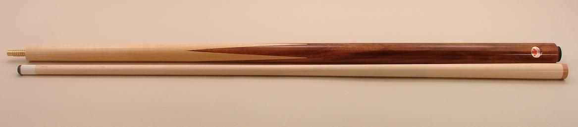 Here is a neat little cue. Its one that I made for myself to use in a couple little barbox tournaments. The butt is an old Dufferin that I converted with one of my performance shafts. The butt does not have the fat Duff taper but instead it has my regular taper used on my playing cues. Take note that the cue is 57" as thats what I prefer on the barbox...I'm a firm believer that shorter cues do play better. The pin is a brass 3/8-10. The cue weighs 19oz with the butt being 15.1oz and the 12.75mm shaft is 3.9oz. This shaft does have some brown sugar marks (can be seen in the photos) as I always pick these for my personal shafts. I feel the uglier shafts are more dense & play better. The grain count on this shaft is incredible...actually as good as it gets. The ferrule is an unbreakable linen base and the tip is one of my soaked & pressed Triangles. A phenolic collar was added to the shaft for strength.