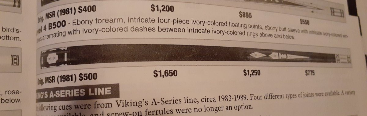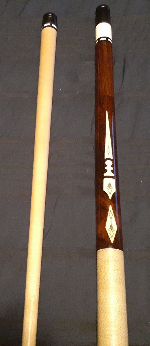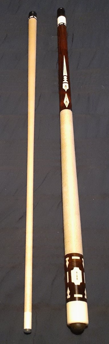 I have an older Viking cue for sale. It is a 1981 model. Blue Book values it at $1650 @ 98% condition. This was a high dollar cue in the day. This one is slightly different. Everything is the same with the exception of the joint and ringwork on the joint. The joint on this one is phenolic and not stainless. The ringwork at the joint is different. The ringwork on the original cue did not match other ringwork on the cue. The ringwork on this cue matches the other ringwork on the cue. One other thing about this cue is it appears the forearm has been spliced. About an inch above the forearm points you can see a very fine line showing this. Whoever did this did an excellent job. The cue is in great condition and very sound. Butt 16.02 Oz. Shaft is 12.25mm natural ferrule 3.26 oz. Unknown tip. Probably LePro or Triangle. 58" cue, 29" split. Ebony cue with white inlays. 3/8"-10 joint pin. Cue is dead straight. This thing has a great hit, as good as my Richard Black. You would not be disappointed with this cue. Very sound and a great player. Priced to move at $600.
