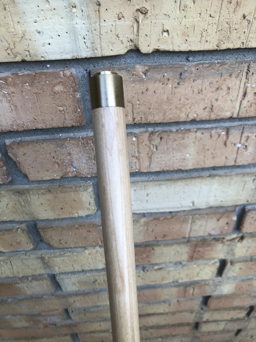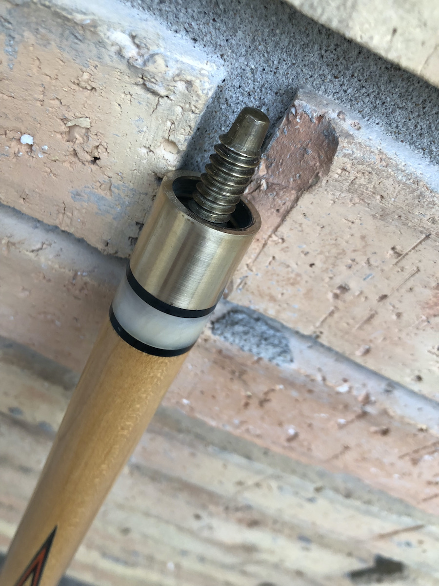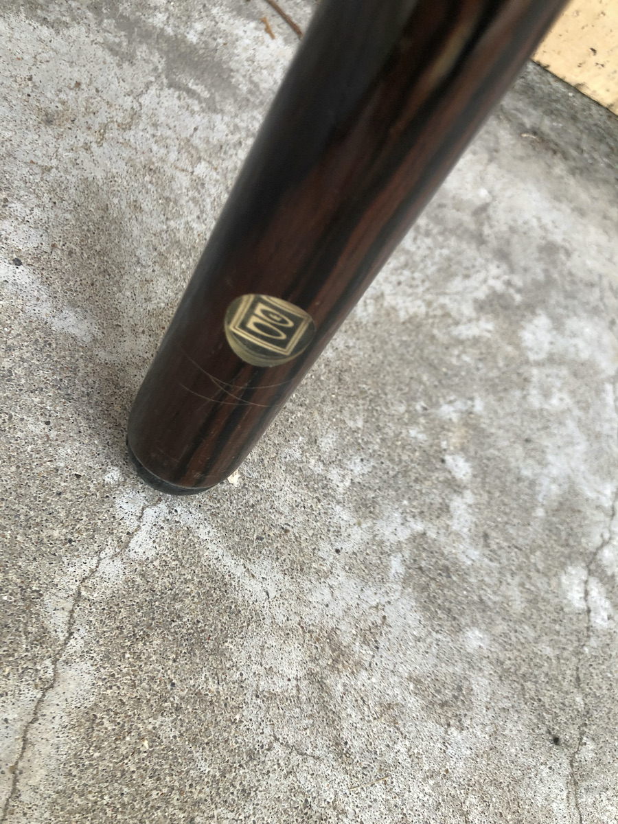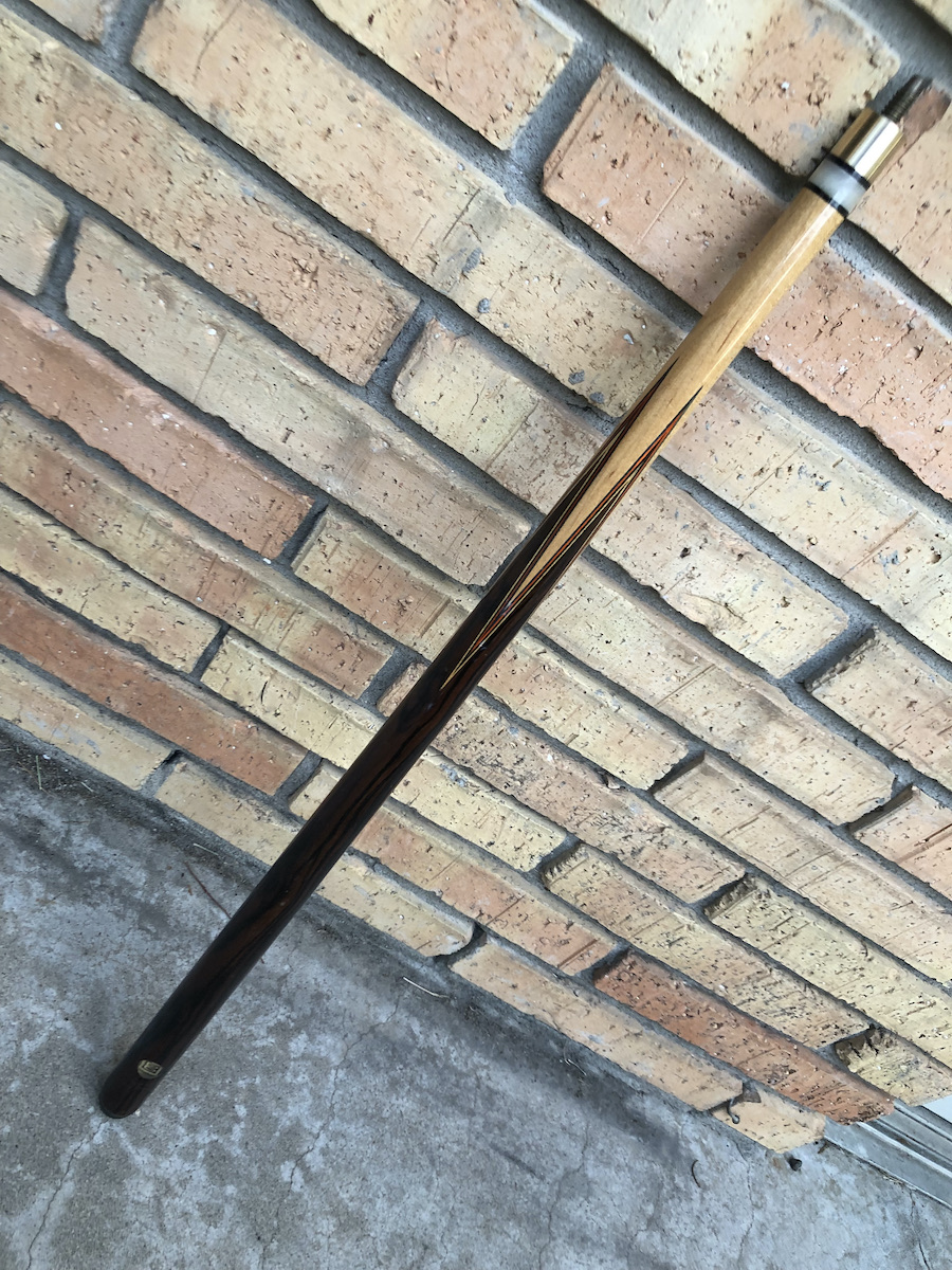 The cue was refitted with a laminated shaft using the existing brass joint and is like new.