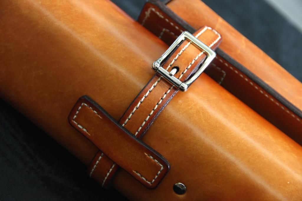 I wanted Form with Function and personally a case without pocket for accessories wouldn't fit that criteria. However adding a pocket would be unsightly and spoil the form so i came up with this this double strap on style pocket, i doubt i'll ever remove it but the leather strap-ons really adds another layer of character to the case especially with the thick white stitching.