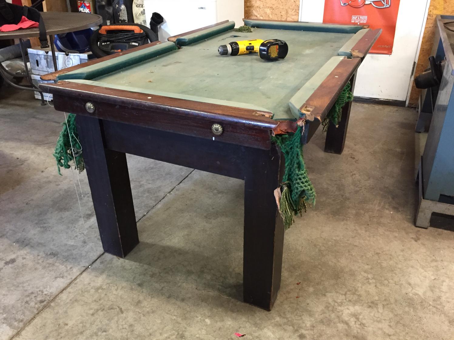 Hello all. Picked up this vintage Nat. Billiard Co. half scale table (playing surface 56"x28"). Full size framing with stamping indicating it was built between 1900 and 1910. Has 3/4" slate. Table complete EXCEPT (big except) it has no pocket irons. Pictures show it had nets on it at some point, but I don't know if these were original. Holes in rails indicate it needs #3 pocket irons, but they need to be smaller than normal. Have searched everywhere and called the leading pocket iron experts, but they haven't given me much hope of finding what I need. The holes for the pocket iron bolts are 5-3/8" center to center on the corners, and 5-7/8" on the sides, which is an inch or so under standard. Please give me your thoughts on making a set (how, material, etc.) vs. going to a top mount snooker bracket style, presuming a closer fit could be found. Thank you!