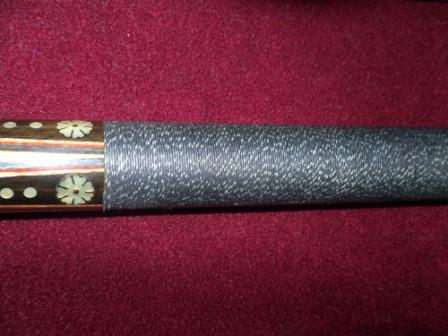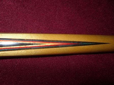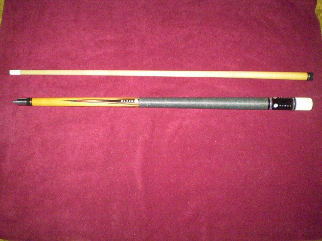 This Palmer cue is from the 1970's 3rd catalog Model #13. All original with no dents or bruises. The finish is thin now and the silver rings are exposed. It appears to have a very thin hair line surface crack in the forearm under the finish. You have to look closely to see it. The cue comes with (2) 12.5 mm shafts a (30 1/4" Perfectly straight-- wt. 4 oz) and a (28 3/4" which has a slight bow--- wt. 3.75 oz). The butt is 28 1/2 " in length from top of the joint to bottom of butt cap and weighs 16 3/8 oz. ........The cue hits solid and is in good condition....... It's a nice looking cue and the price is very reasonable at.......$550.00