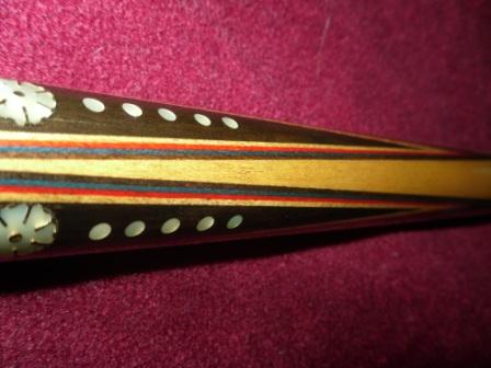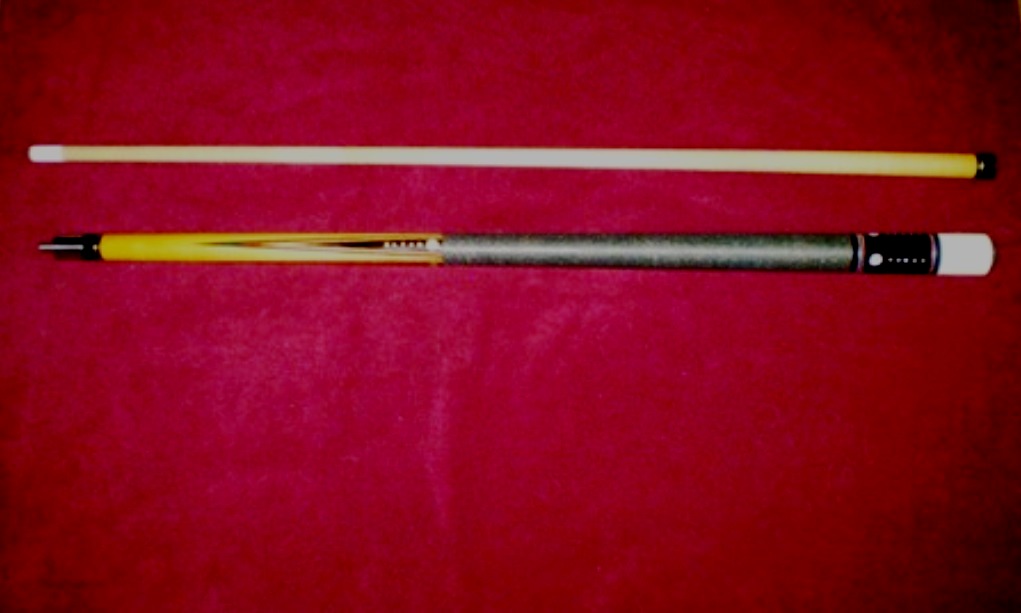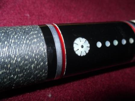 This Palmer cue is from the 1970's 3rd catalog Model #13. All original with no dents or bruises. The finish coating is thin now at the bottom of the butt and the silver and red rings are exposed. It appears to have a hair line surface crack in the forearm under the finish. You have to look closely to see it. The cue comes with (2) 12.5 mm shafts a (30 1/4" Perfectly straight-- wt. 4 oz) and a (28 3/4" which has a slight bow--- wt. 3.75 oz). The butt is 28 1/2 " in length from top of the joint to bottom of butt cap and weighs 16 3/8 oz. ........The cue hits solid and is in good condition....... It's a nice looking cue and the price is very reasonable at.......$550.00