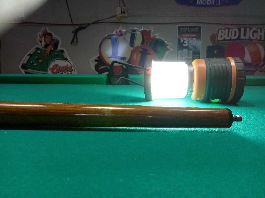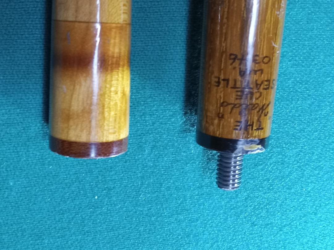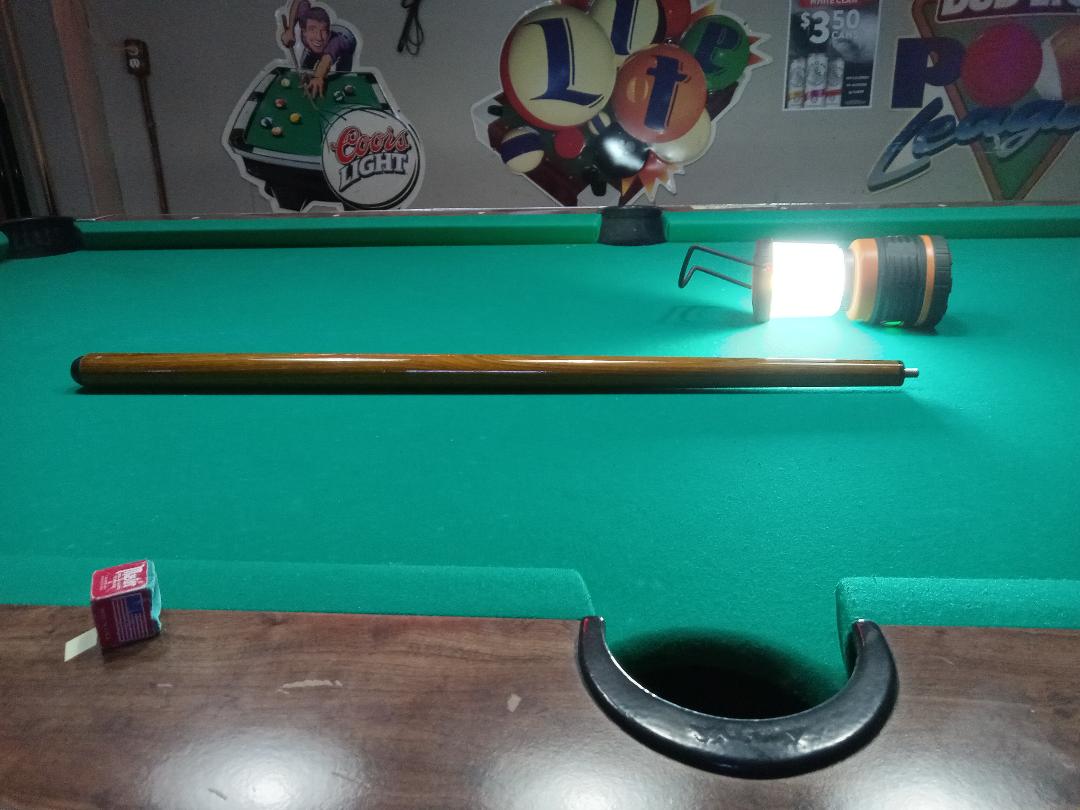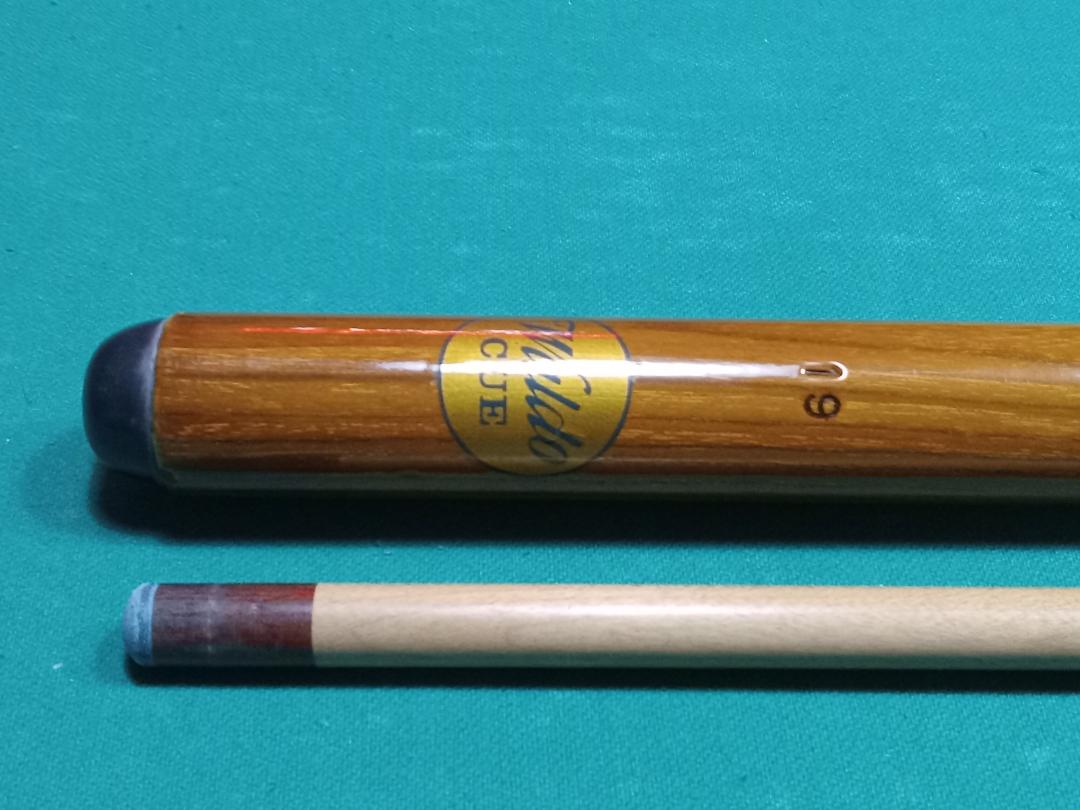 Vintage Cue made by Russ Waldo who passed away in 1993, cue has a unique construction and does have a warp in the joint part of the forearm, is warped universally in the joint so when rolled together doesn't roll too bad, the shaft rolls flat and has a nice firm hit. The cue is 18.2 oz and 13.13 mm at the tip which is something single layer. The cue is standard 58" .865 at the joint 1.26" at the butt , shaft weight is 4.8 oz so super dense