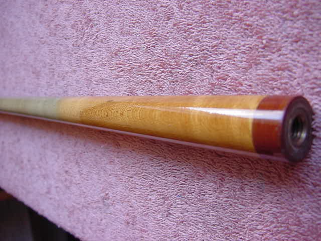 unknown Quality haft: 3.97 oz. 12.5 mm 28 7/8" long. Perfectly straight. Fancy Wood - No dings - unknown thread - It is not 5/16 x 18 or 5 /16 x 14. It looks like 5/16 x something. Maybe 5/16 x 16. It has a brass thread insert. $75. Shipped