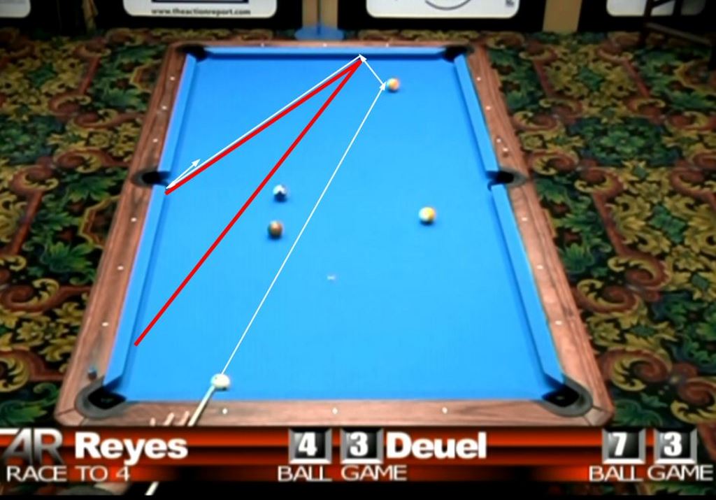 Corey tried a pretty difficult shot. There wasn't that wide of a lane for him, considering that he's almost shooting off the rail, the ball is almost 9 ft away and he's trying for a thin hit. That's a whole lot of perfection there. He wanted to get past the side pocket, because of he hit above the side pocket, it was headed towards those 2 balls there. He tried a tough shot, he was 1/2 inch away from hitting it good and would have probably went on to win the game if he wouldn't have hit the tit.