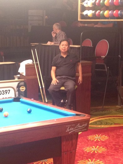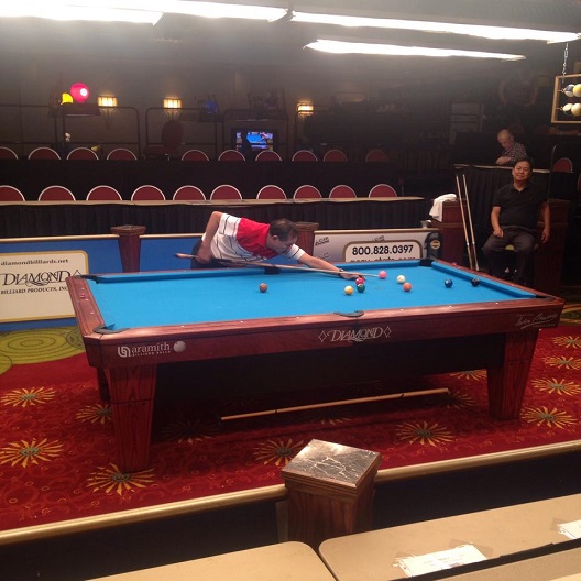 Jose on the table practicing. He's shooting what looks to be semi-spot shots in the corner pocket over and over again.