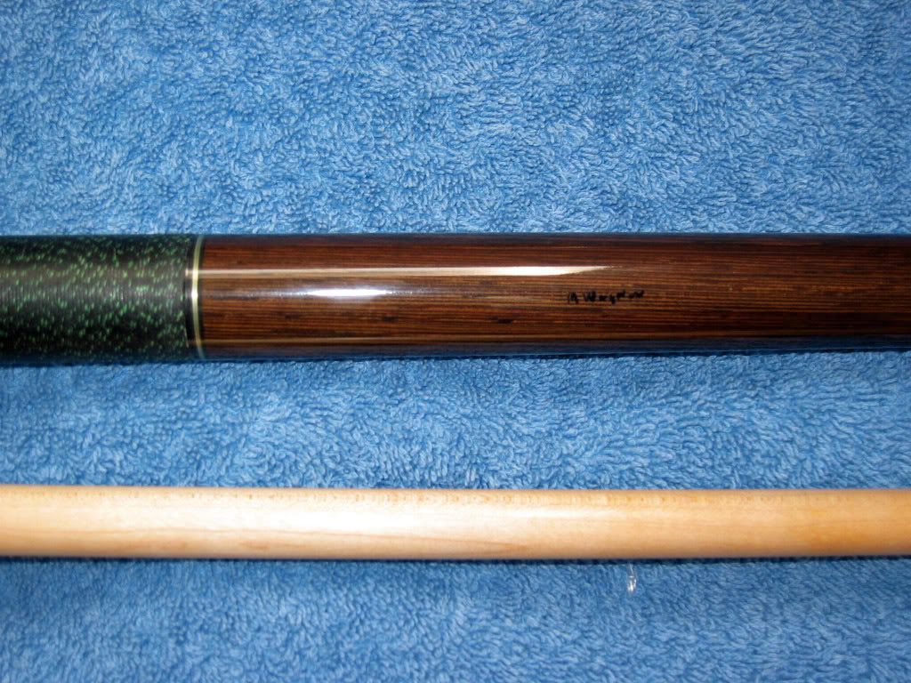 Up for sale is a Raven solid core plain jane cue. Wood is Wenge, a nice Brown with black grain pattern. Raven serial number: SN-000078. I purchased this cue used, and it is in good condition. The shaft has some small dents. 58.5 inches, 18 oz, Bronze 3/8-10 pin, Flat faced, IVOR-X ferrule. See Michael Wagner's (Raven Cues) website for full details, noting that the tip was changed by the previous owner. http://www.ravencues.com/cue46.html. Cue rolls straight.