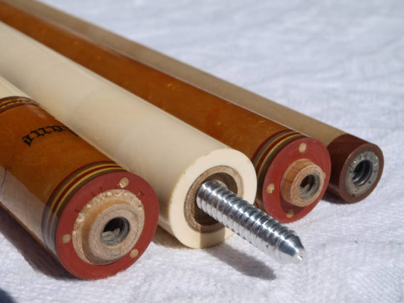 I thought I would share these pictures of a Harvey Martin cue I spotted on Ebay. I love the pinned veneer stacks! very cool.