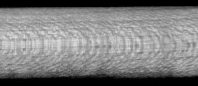 The greatly-magnified image above of the shaft taken near the tip shows a grain count of 10 layers over a 13mm diameter. (I had to turn it into a black-and-white image and increase the contrast to make the grains visible. In person they are so fine and uniform that they are almost impossible to see.) This works out to an incredible 20 grains per inch. This means that the tree from which this piece of wood came from grew very slowly and evenly, ideal for the highest quality shaft. What this proved to me was that not only is Mr. Dieckman a first-class artisan, he also knows good wood when he sees it.