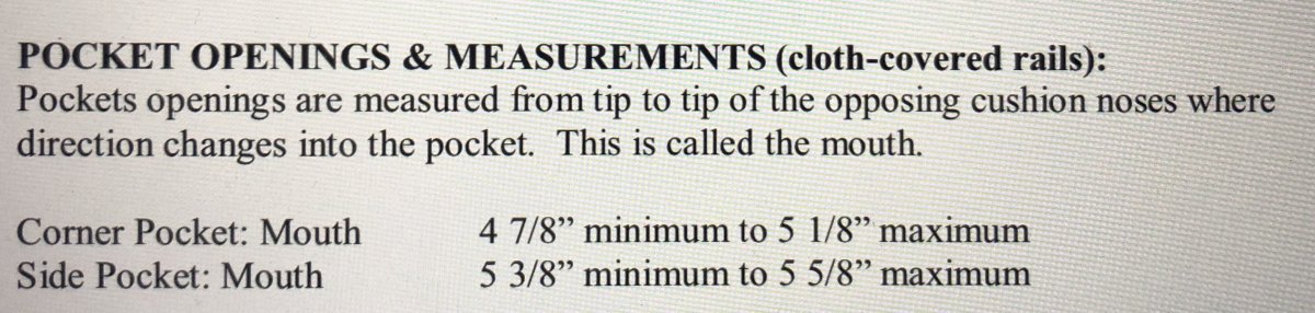 Here are the pocket size I play on at Sierra Billiards and several of my friends’ home tables. Sierra