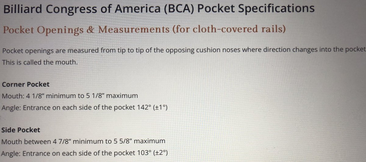 Below are BCA’s specifications for pool table pocket size for professional and recreational play.