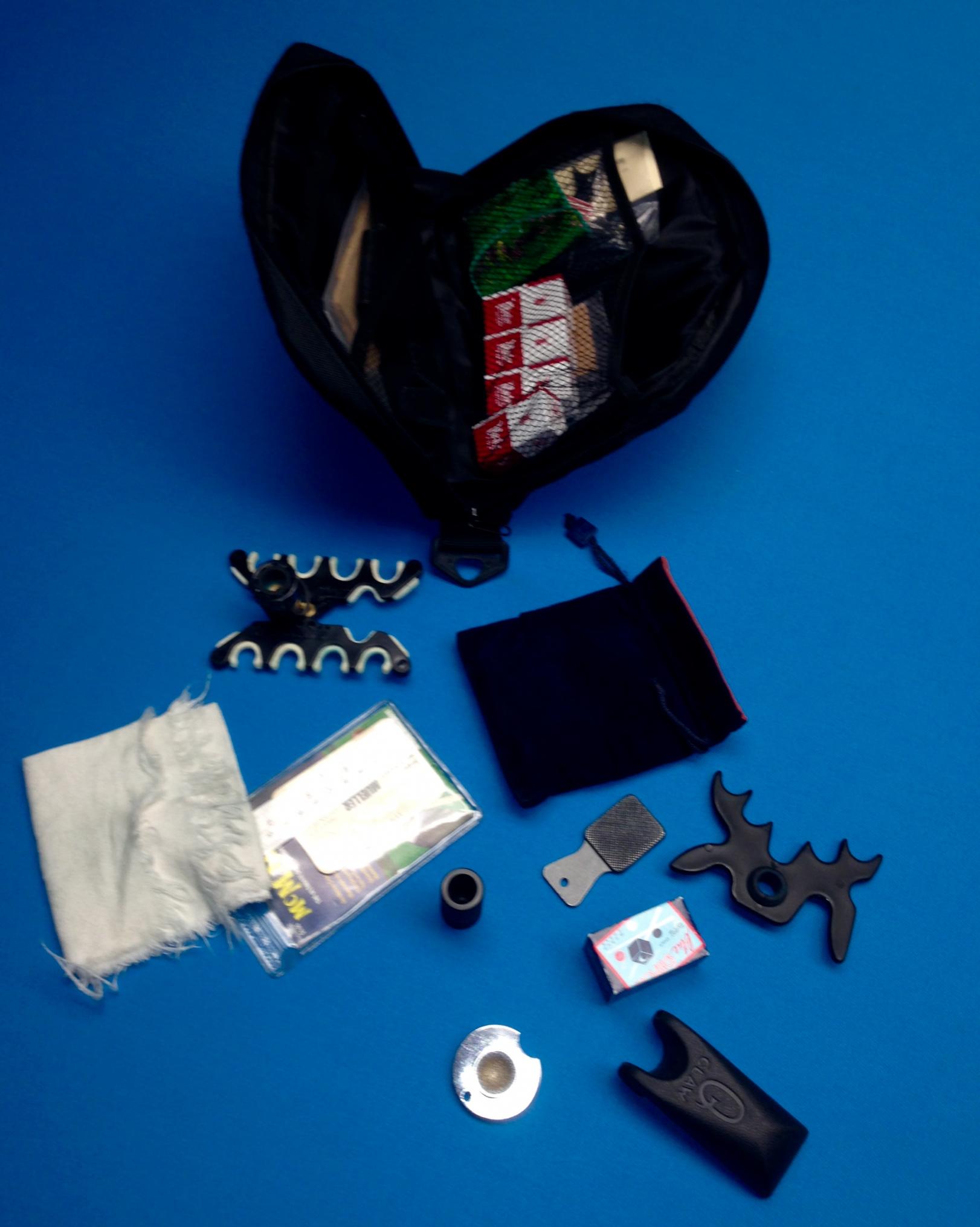 Just the basics. A conversion from a local cue maker, Greg Sowder, 6 shafts with different tapers and weights, old Ron Thomas 2x4 that does a 1x6 quite well and some simple accoutrements.