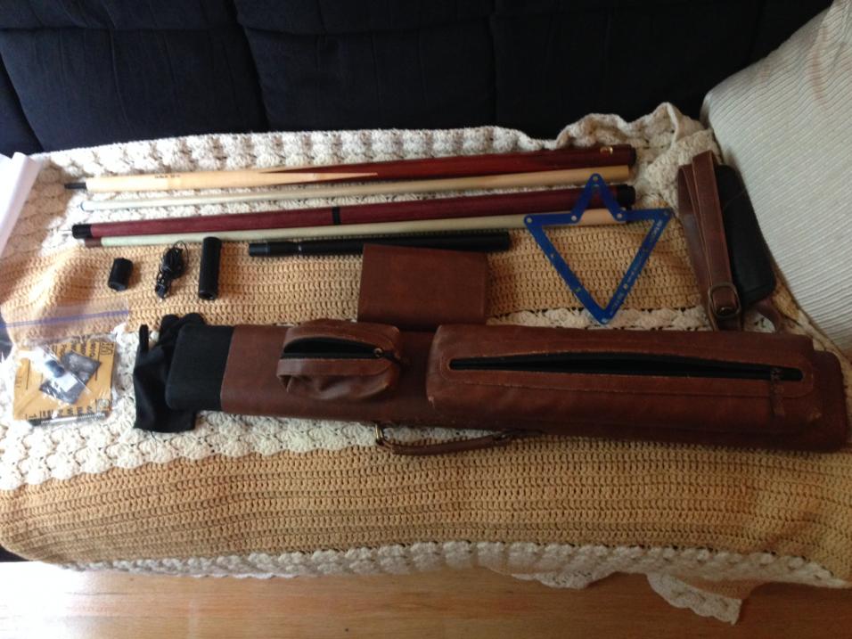 My case jb seahawks super bowl tribute , j&j butterfly jump break cue, Bob Danielson lucky lady cue . And cue extion, and old chalk.