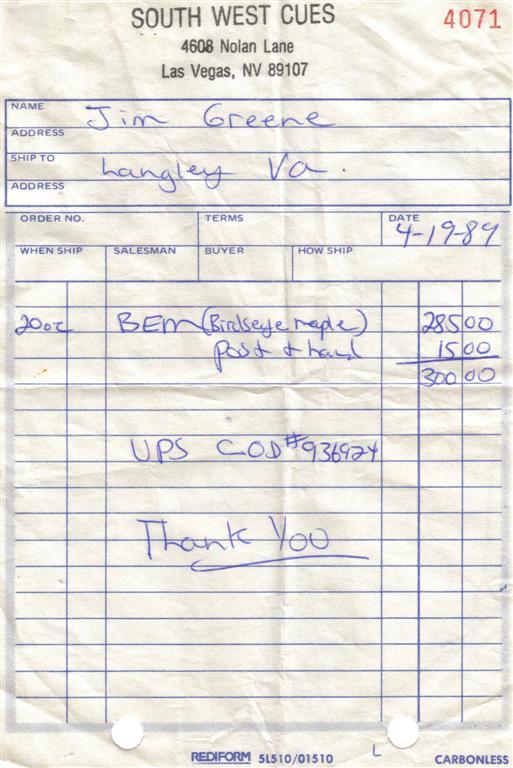 Balabushka for $100 got it around 1980. I still have it. Got another for $500 around 1985 and I still have that one also. I will be selling both of these cues before the end of the year. We are moving and I am getting rid of everything I own except my tools. Art, books, furniture, collectibles, everything, 35 years of collecting, it's all going. I don't want to own any of that kind useless of crap anymore.